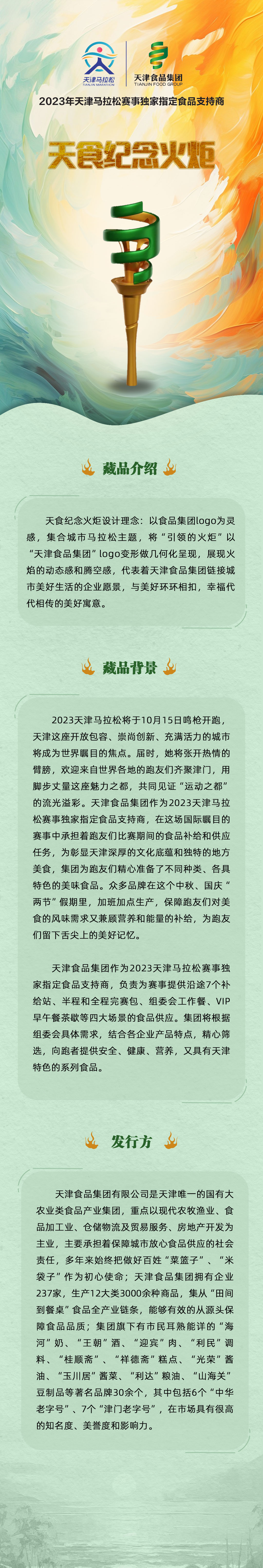注:“2023天津馬拉松賽事天津食品集團紀念火炬”數字藏品只面向參賽運動(dòng)員免費限量發(fā)放,不在互聯(lián)網(wǎng)上進(jìn)行銷(xiāo)售。參加半馬和全馬的運動(dòng)員完賽后,可在終點(diǎn)處天津食品集團展位掃描現場(chǎng)二維碼申領(lǐng),數量有限,先到先得。